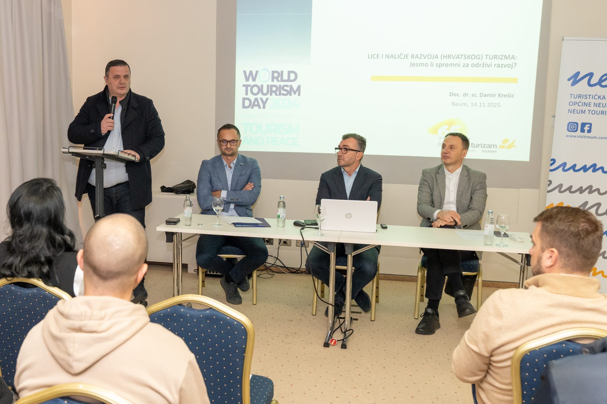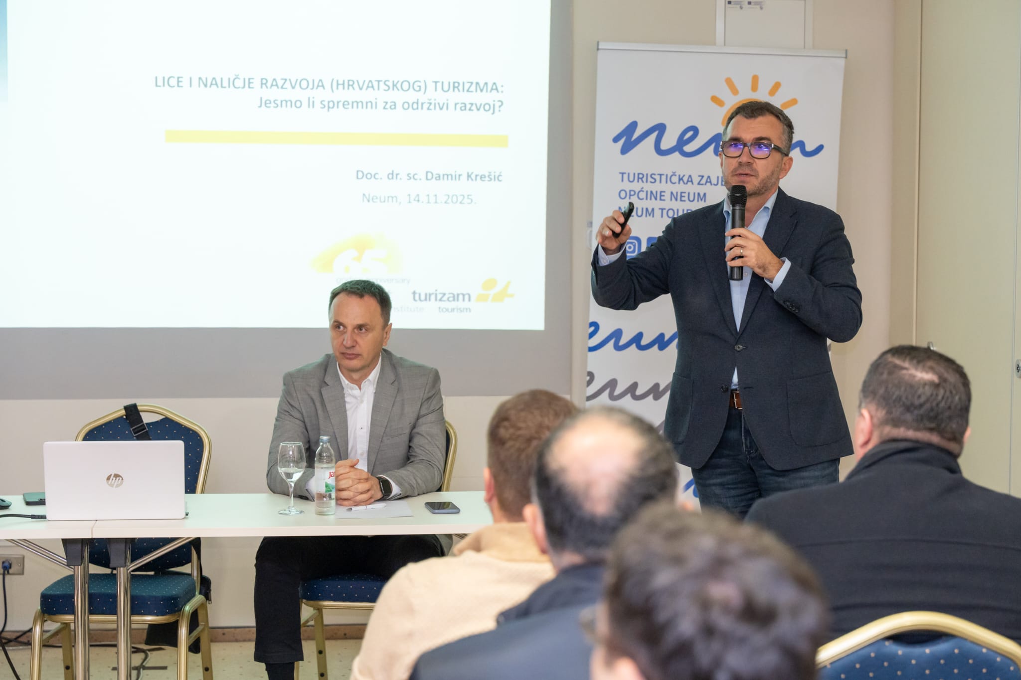 Na temu “Održivi turizam u Neumu: Da li je rast uvijek jednak razvoju?” govorio je prof. Damir Krešić, ravnatelj Instituta za turizam u Zagrebu koji je u svom izlaganju iznio koje su to prednosti i mane turizma, a posebno masovnog turizma. Naglasio je kako je turizam nekada bio isključivo za one bolje platne moći, dok je danas turizam stil života i da putuje svatko, što donosi ljudima i dobre i loše strane turizma. “Jedan od negativnih utjecaja masovnog turizma, svakako je smanjena kvaliteta života lokalnog stanovništva, te velik negativni utjecaj na prirodu i okoliš. Za Neum je ključno da se ustanovi koji su njegovi prihvatni kapaciteti te da se u tom smjeru razvija” zaključio je prof. Krešić. Također je iznio neke od prijedloga za unaprjeđenje Neumskog turizma iz jedne od studija na kojoj je radio.