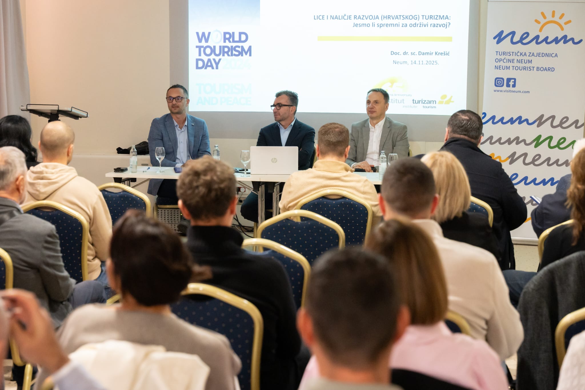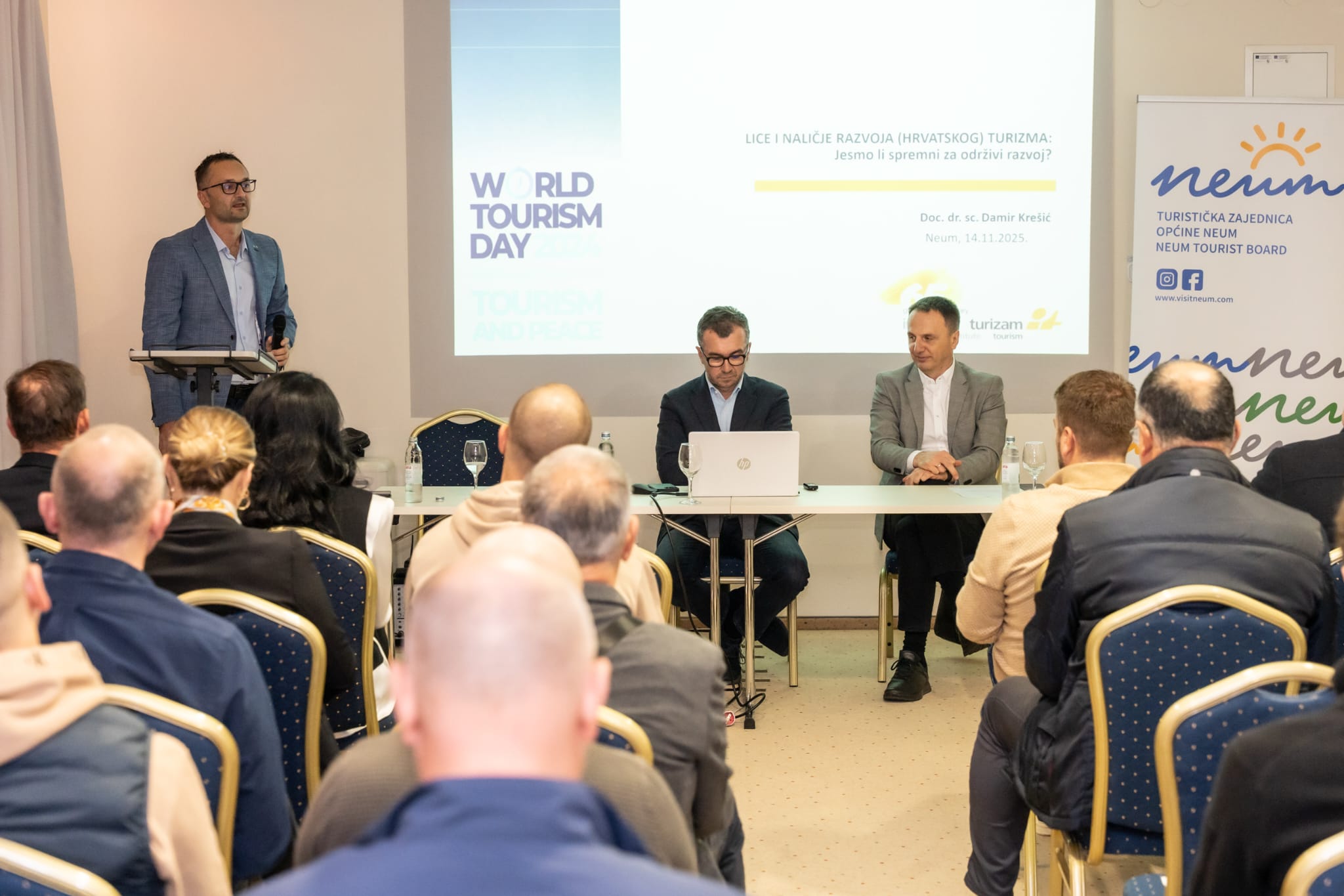 Na temu “Održivi turizam u Neumu: Da li je rast uvijek jednak razvoju?” govorio je prof. Damir Krešić, ravnatelj Instituta za turizam u Zagrebu koji je u svom izlaganju iznio koje su to prednosti i mane turizma, a posebno masovnog turizma. Naglasio je kako je turizam nekada bio isključivo za one bolje platne moći, dok je danas turizam stil života i da putuje svatko, što donosi ljudima i dobre i loše strane turizma. “Jedan od negativnih utjecaja masovnog turizma, svakako je smanjena kvaliteta života lokalnog stanovništva, te velik negativni utjecaj na prirodu i okoliš. Za Neum je ključno da se ustanovi koji su njegovi prihvatni kapaciteti te da se u tom smjeru razvija” zaključio je prof. Krešić. Također je iznio neke od prijedloga za unaprjeđenje Neumskog turizma iz jedne od studija na kojoj je radio.